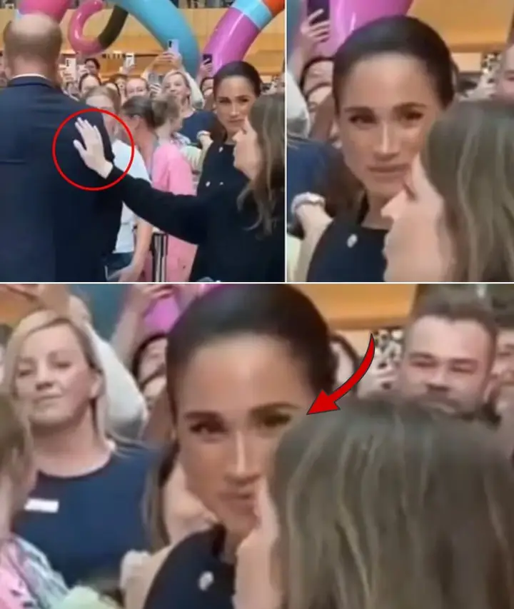 Footage appeared to capture Meghan Markle glaring at an adviser after she tapped Prince Harry on the back during a children’s hospital visit this week.