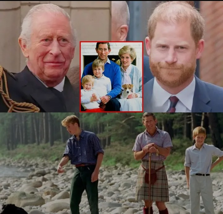One short clip shows King Charles, dressed in a kilt, fishing with a nine-year-old Prince Harry in Scotland, with his elder son and heir, William, featuring more prominently.
