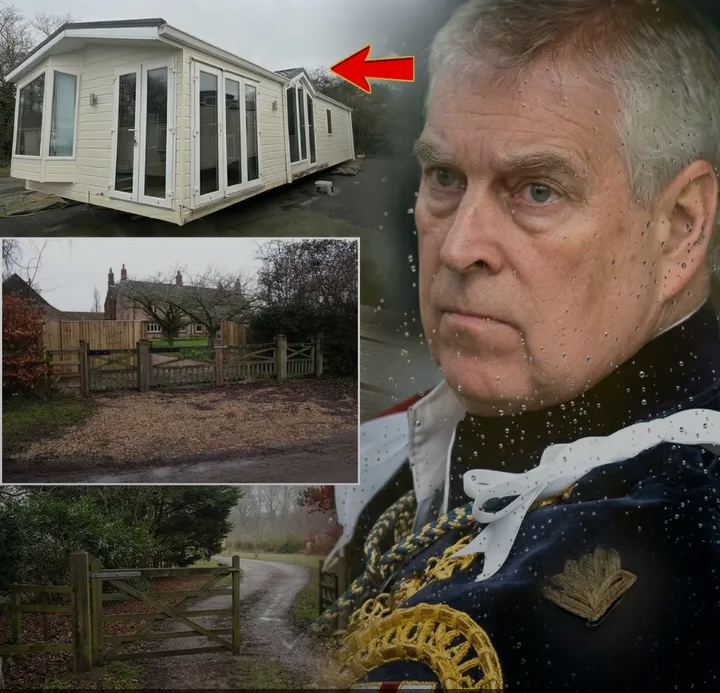 Andrew Mountbatten-Windsor has swapped his Grade II 30-room Royal Lodge mansion for a pre-owned two-bed static caravan costing £26,000, which now sits propped on bricks in his Norfolk garden, its exterior showing visible moss growth.