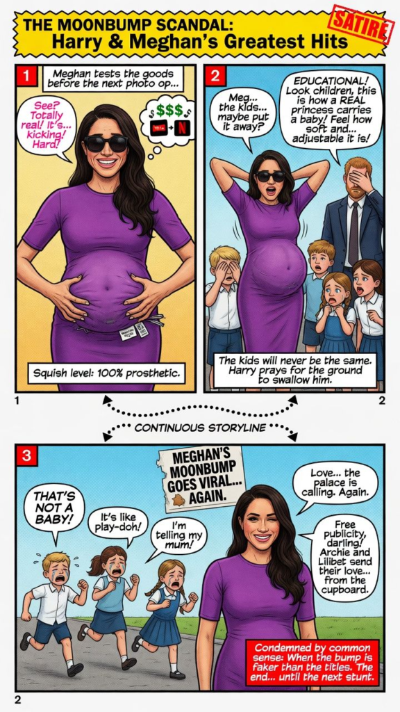 In a jaw-dropping new scandal that has royal watchers worldwide gasping for air, the Duchess of Sussex, Meghan Markle, has once again thrust herself into the spotlight for all the wrong reasons. Eyewitnesses and leaked images suggest the former actress was seen publicly “squishing” her suspiciously squishy pregnancy bump – the very same one critics have long dubbed her “moonbump” – while blatantly flashing young children at a public event. Prince Harry, looking utterly mortified, reportedly tried to intervene but only made the cringeworthy moment even more unforgettable.