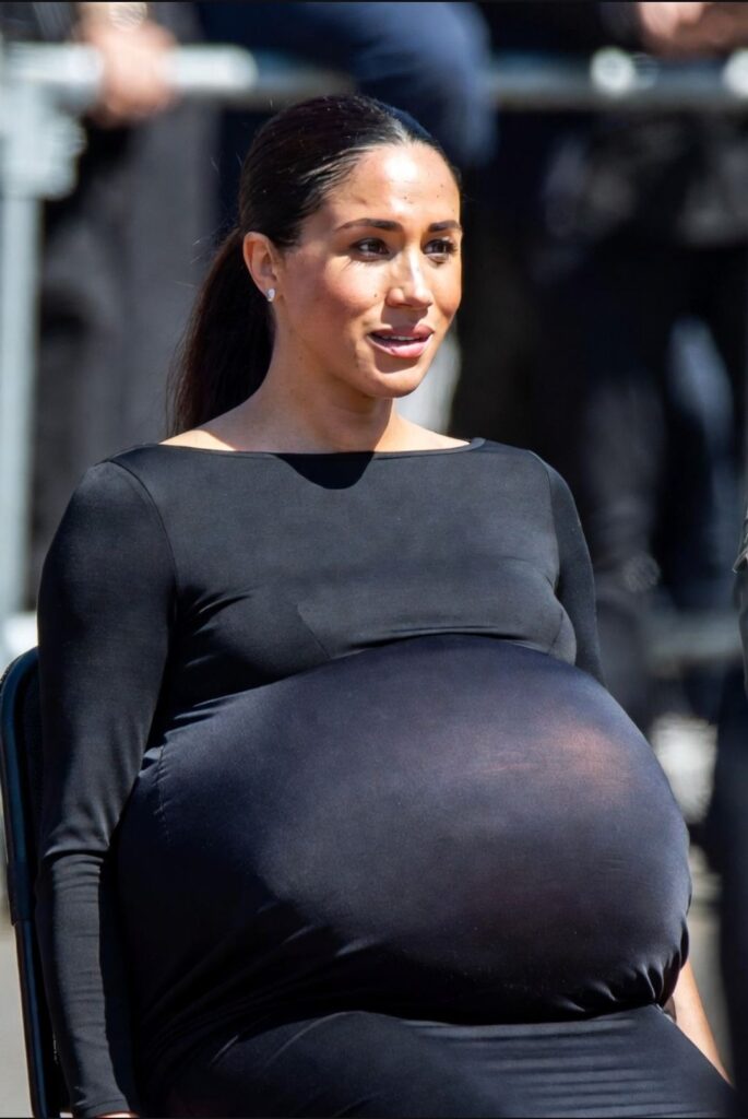 Picture this: It’s 2019. Meghan, glowing (or so we thought), struts into a cozy community event in a tight beige dress and matching blazer that hugged every curve of her alleged seven-month bump. She smiles that practiced Hollywood smile, chats with locals, then – boom – plops down into a chair like any ordinary person. Except this wasn’t ordinary. As her backside hit the seat, the “bump” visibly compressed and squished inward, folding like a half-deflated beach ball. No pregnant belly on Earth does that. Real ones are firm, taut, and protective. This one? It caved like cheap padding.