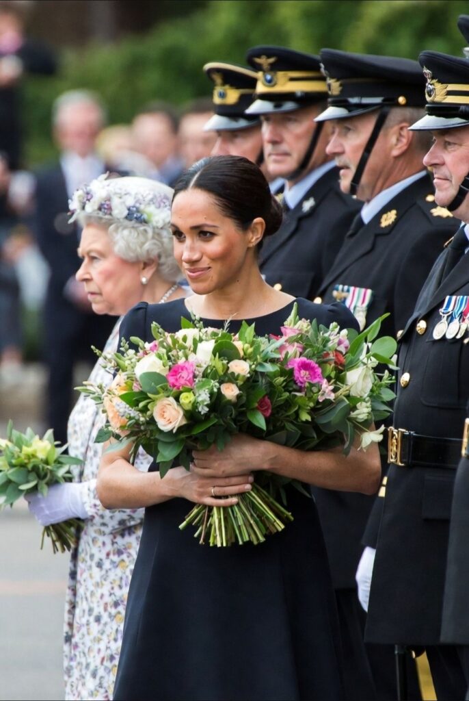 Picture the scene: It’s a sunny summer day in Widnes, Cheshire. The Queen, resplendent in her signature bright lime-green coat and matching hat, is gracefully making her way along a cordoned-off street lined with eager well-wishers waving Union Jacks and clutching flowers. Walking just behind her is a fresh-faced Meghan in a tailored cream cape dress, black belt, and sleek handbag – the picture of modern royalty… or so it seemed.