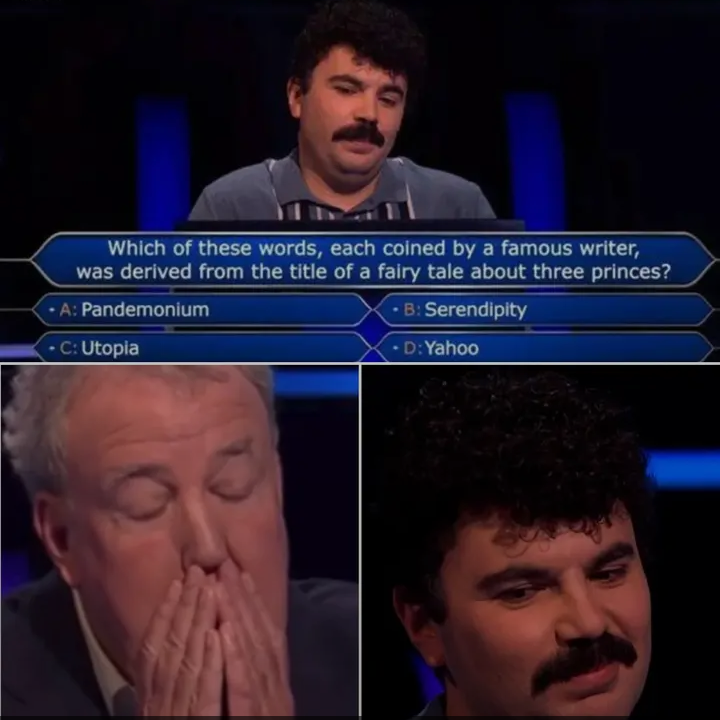 Clarkson then asked: “Which of these words, each coined by a famous writer, was derived from the title of a fairytale about three princes? a)Pandemonium b) Serendipity c) Utopia d) Yahoo.”