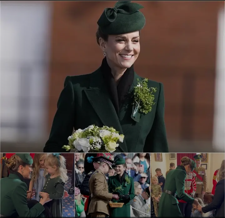 Dressed in an elegant dark green Alexander McQueen coat with a matching-coloured hat, Kate joined Irish Guards and their families in the Officers’ and Sergeants’ Mess following the St Patrick’s Day Irish Parade at Mons Barracks, Aldershot, on Tuesday.