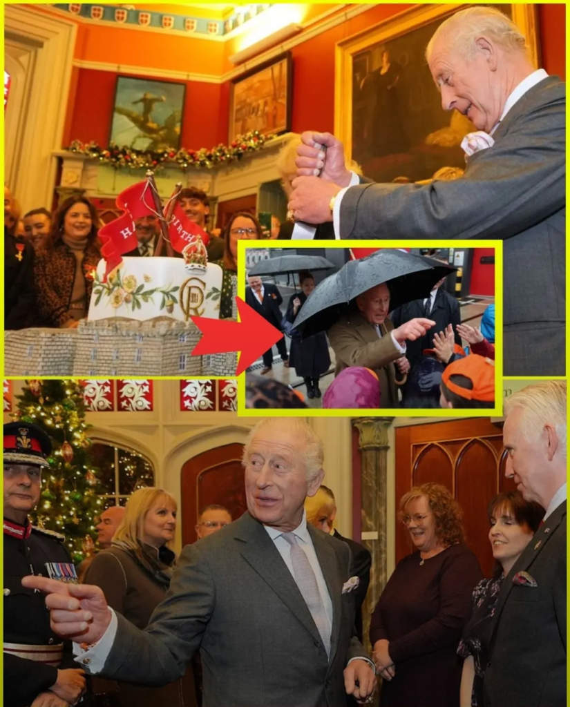King Charles braved treacherous conditions today as he marked his 77th birthday in south Wales. Accompanied by the Queen, Charles celebrated his special day by cutting an intricately decorated cake in the shape of a castle, while visiting a majestic 19th century castle.