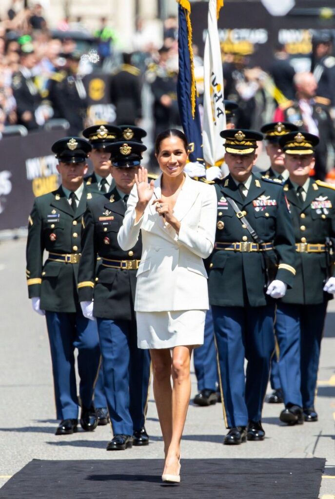 The latest evidence exploded across social media this week in a pair of videos that have racked up thousands of views and a firestorm of comments. In one clip, captured at a high-profile veterans’ event tied to Prince Harry’s Invictus Games, Meghan struts confidently down a sunlit parade route in a crisp white blazer dress and heels, smiling, waving, and adjusting her hair like she’s on a Hollywood red carpet. Veterans in uniform trail behind her, some carrying flags, others marching in formation—yet she’s positioned front and center, commanding the frame as if she’s the star attraction. Crowds cheer, banners reading “Invictus Games” flap in the background, and security hovers nearby. But as one viral commenter put it: “She’s playing soldier while the real heroes walk in her shadow.” The optics, insiders say, are disastrous—and tellingly familiar.