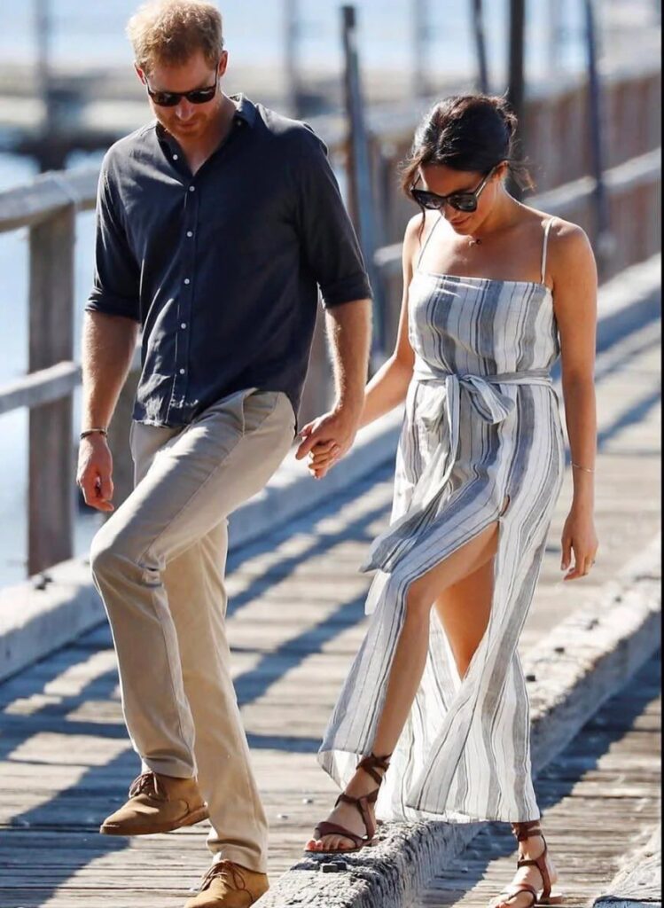 The evidence? Crystal-clear photos from that very day, now going viral on X, show the then-Duchess of Sussex in a jaw-droppingly inappropriate striped spaghetti-strap maxi dress – complete with a thigh-high slit that screamed “beach club” instead of “palace protocol.” As Harry and Meghan strolled hand-in-hand along a wooden jetty overlooking the island’s pristine waters, the dress did exactly what any sane stylist would have predicted: it billowed, it gaped, and it revealed far more than any royal ever intended.