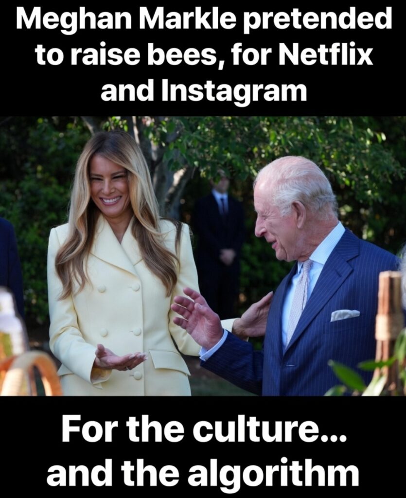 It looks like they used CGI enhancement or simply released a controlled batch for the shutter clicks.”But the real sting? The financial upside. Sources close to Archewell say the fake beekeeping narrative helped secure lucrative brand extensions — from a rumored organic honey line (that never materialized) to guest appearances on lifestyle shows where Meghan was hailed as “the new face of conscious celebrity.” Netflix executives, according to leaked internal emails obtained by this publication, were thrilled with the “visuals.” One email allegedly read: “The bee footage is pure gold — aspirational, calming, and completely on-brand for the wellness pivot. Keep it coming.”Royal watchers and celebrity skeptics have long suspected something was off. Remember the 2024 “honey harvest” video that racked up over 12 million views? Fans praised Meghan’s gentle handling of the frames. Insiders now say those frames contained no live colony — just harvested honey poured in moments before rolling cameras. “She practiced the motions with an empty hive the day before,” one source chuckled. “It was like watching an actress prep for a scene. Because that’s exactly what it was.”The scandal has already sent shockwaves through Sussex Squad loyalists and royal commentators alike. “If this is true, it’s a betrayal of everything she claimed to stand for,” said royal biographer Lady Colin Campbell in an exclusive interview. “Meghan sold the world this image of a hands-on, bee-loving mother reconnecting with nature after escaping the palace. If it was all pretend for Netflix and likes, that’s not just embarrassing — it’s calculated.”Harry, meanwhile, has reportedly stayed silent on the matter, though palace insiders claim he was “uncomfortable” with how far the staging went. One friend of the couple whispered: “He went along with a lot for peace, but even he raised an eyebrow when the prop bees arrived in climate-controlled vans.”As of this writing, representatives for Meghan Markle and Archewell have not responded to multiple requests for comment. Netflix declined to address the specific allegations but issued a vague statement: “We support our talent’s creative visions and authentic storytelling.”Authentic. There’s that word again.So what does this mean for the Duchess who once told the world she wanted nothing more than to “live quietly and give back”?
