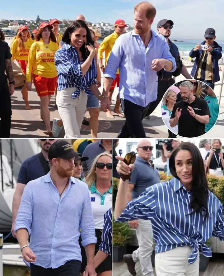 And who can blame the outrage? Let’s rewind to the scene at Bondi. Images circulating from the visit show Meghan, radiant in a blue-and-white striped shirt casually tied at the waist, paired with crisp white wide-leg trousers and matching sneakers – a casual-yet-chic look totaling a eye-watering £1,200. She’s seen smiling broadly, hand-in-hand with Prince Harry amid a backdrop of lifeguards and beachgoers, looking every inch the compassionate royal. In another shot, she’s locked in a tight embrace with a survivor, her expression one of deep concern – or is it? Because mere hours later, that very outfit pops up for sale on her brand’s site, with fans (or opportunistic buyers) able to snap up the “exact same” pieces she wore while comforting the heartbroken.