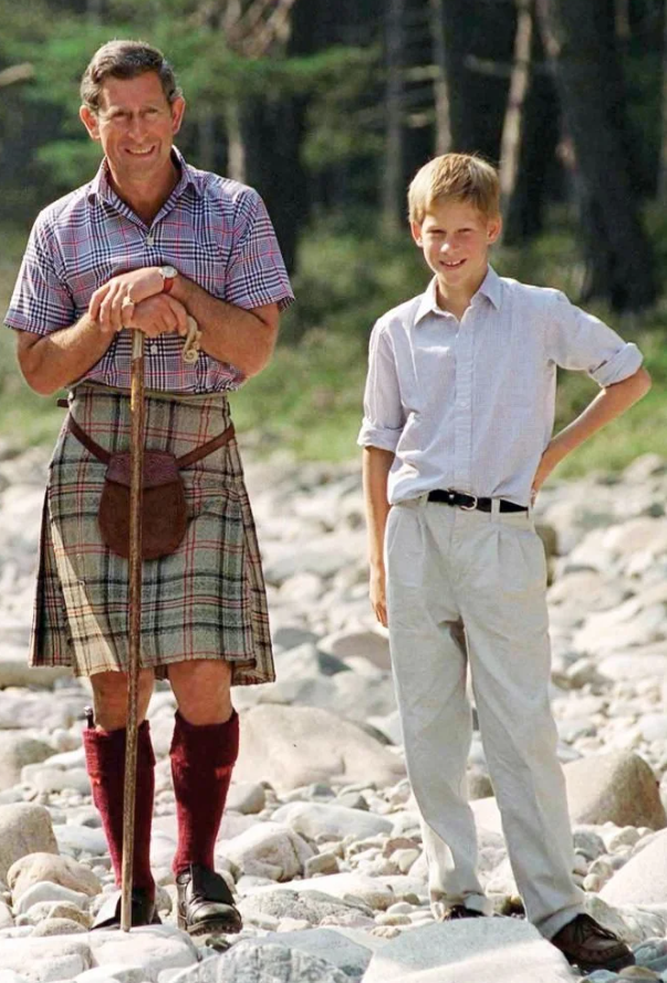 The footage features a short clip of the future Duke of Sussex fly fishing with his father as a young boy.