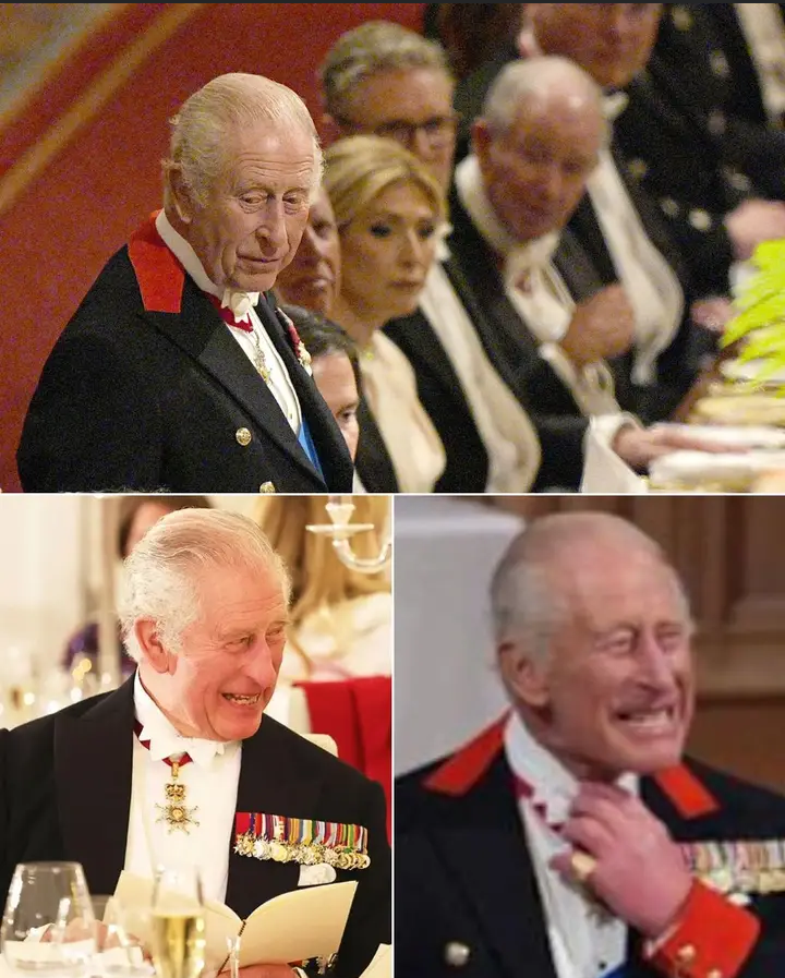 King Charles (left) had the White House audience in stitches during his toast at Tuesday night’s state dinner hosted by First Lady Melania Trump (center right) and President Donald Trump (right)