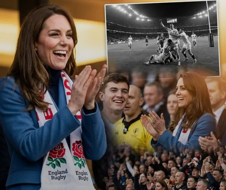 Catherine, Princess of Wales, wearing a navy coat and a red and white England rugby scarf, attends a rugby match.