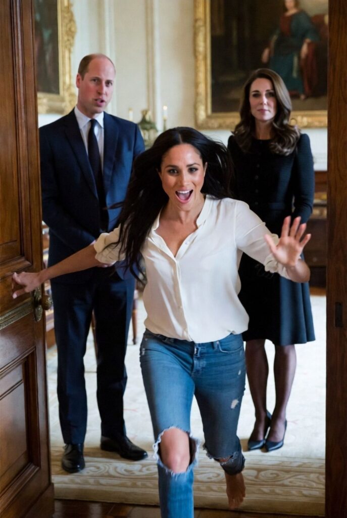 Because here’s what actually happened that day, according to the version Meghan herself keeps retelling with zero self-awareness: she treated one of the most significant family introductions in modern royal history like a casual Netflix binge session. Ripped jeans? Bare feet? Immediate physical affection with people she’d never met – people whose entire lives are built on centuries of protocol, composure, and yes, boundaries?