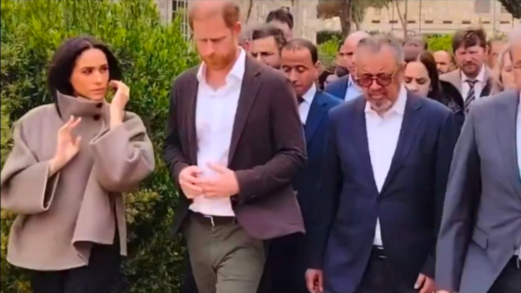 This isn’t isolated. Body language analysts have long noted Meghan’s tendency to physically anchor herself to Harry in public, perhaps to project unity or control the narrative. But in Jordan, that habit backfired spectacularly. While the couple posed for “heartwarming” shots – Meghan crouching with kids, Harry stroking his beard thoughtfully – the off-script moments tell a different story. One witness at a hospital visit described a “tense shift” after cameras turned away, with the couple exchanging words that didn’t look loving. Meghan’s emotional displays (fighting tears during poignant meetings) were praised by some, but others see it as performative – especially when juxtaposed with her ignoring basic etiquette.