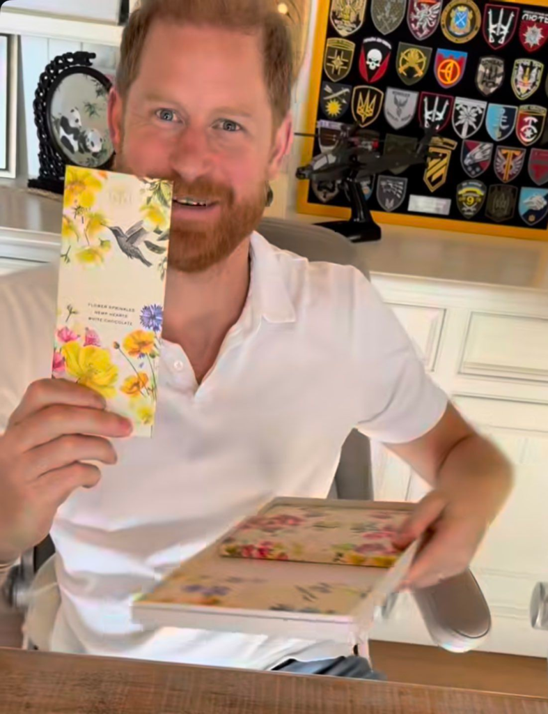 The clip — clearly self-filmed by Meghan — shows her approaching Harry at his desk, box in hand, while their rescue beagle lounges nearby. Harry, in a casual white shirt with military patches visible on the wall behind him, lights up with an enthusiastic “Ooh, yes please!” before selecting the white chocolate bar adorned with flower sprinkles and hemp hearts. “Thank you, love you,” he says warmly, holding the bar up for the camera like a proud child showing off a new toy.