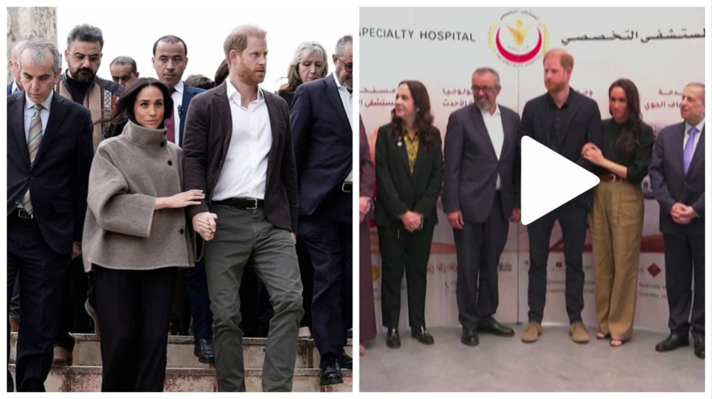 Look at this telling snapshot: Meghan, dressed in a chic gray cape coat and black pants, extends her hand backward to clasp Harry’s, her fingers intertwined in what looks like an unbreakable hold. Harry, in a casual brown jacket and green trousers, follows suit with a neutral expression – but is that a hint of discomfort in his posture? The photo, captured by photographer Aaron Chown, shows the couple navigating uneven stairs in a historic Moroccan setting, with a group of suited men trailing behind. It’s a moment that, on the surface, seems romantic, but dig deeper, and it’s emblematic of a pattern that’s raising eyebrows worldwide.